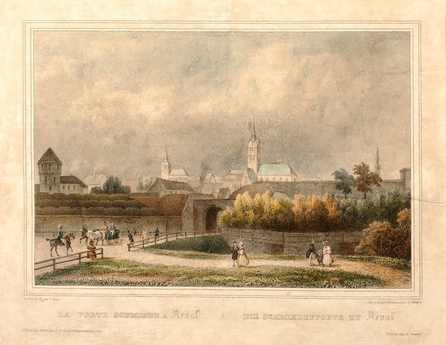 Harju väravad 19. saj esimene pool. Esiplaanil näha Ingeri bastion ja 1760. aastatel ehitatud uus kindlusevärav (vallivärav), mis paiknes algse II eesvärava asukohas. Katus väravaavast paremal on peaväravatorn. Esiplaanil paistab 1820. aastate alguses vanalinna ühe esimese avaliku haljasalana rajatud Lasteaed (Kindergarten). Graafia 1833 – Adam, Victor; Hostein, Edouard.